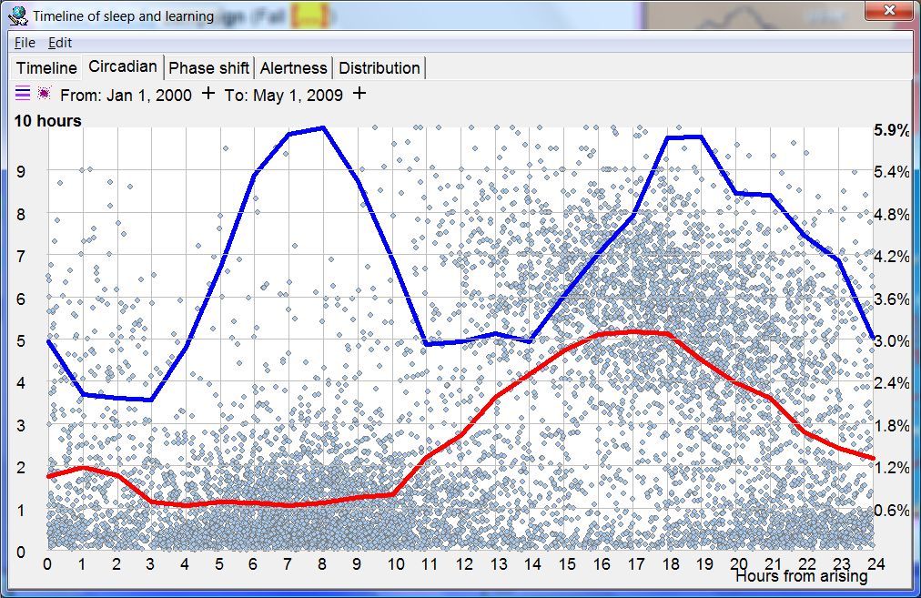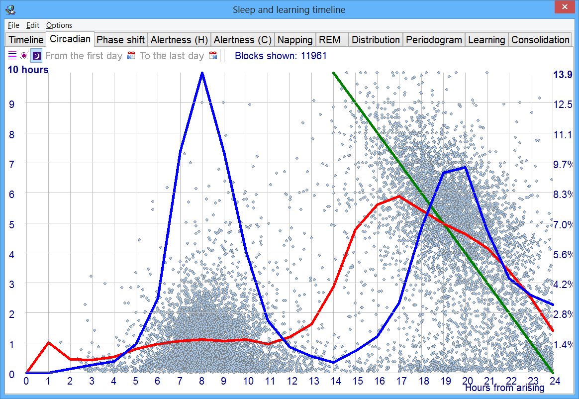 Circadian graph shows individual sleep preferences that help optimize sleep. The presented graph is based on nearly 12,000 sleep episodes. Light blue dots are sleep episode measurements with the duration of wakefulness on the horizontal axis, and the length of sleep on the left vertical axis. The horizonal line (Hours from arising) shows the time that has passed since waking. The graph shows the favorite times for falling asleep as counted from the time of natural awakening (blue homeostatic line), as well as the resulting average sleep length produced by various bed time hours (red circadian line). Right vertical axis refers to the percent of sleep episodes initiated at a given hour (blue line). The left verical axis refers to the length of sleep (dots) or the average length of sleep (red line). The blue line is a rough reflection of the homeostatic sleep drive. The red line shows how long sleep lasts depending on the hour at which it was initiated. The red line is a reflection of the circadian sleep component (i.e. the longest sleep occurs at the start of the subjective night). Note that the peak of the sleep length (red) is slightly phase shifted in reference to the sleep drive (blue) due to the fact that long sleep is mostly achieved by initiating sleep too early. The slanting green line separates the graph into the areas of phase advances (right) and phase delays (left). The line is determined by points in the graph where the waking time (horizontal axis) added to the sleep time (left vertical axis) equals to 24.0 hours. The place where the green breakeven line crosses the red sleep length line determines the optimum balanced sleep cycle of 24 hours. The greater the angle between the green and red lines, the harder it is to balance sleep and fit it into the 24h cycle of the rotating earth. In the presented example, the longest sleep occurs after a 17-hour day (peak of the red line), the best adjusted cycle happens after a 19-hour day (crossing of red and green lines), while the usual waking day lasts around 20 hours (peak of the blue line). This example also shows that the optimum siesta time occurs 8 hours after awakening (blue peak). For example, for an awakening at 6 am, the siesta should begin at 2 pm (8h), and the night sleep at 1 am (19h).