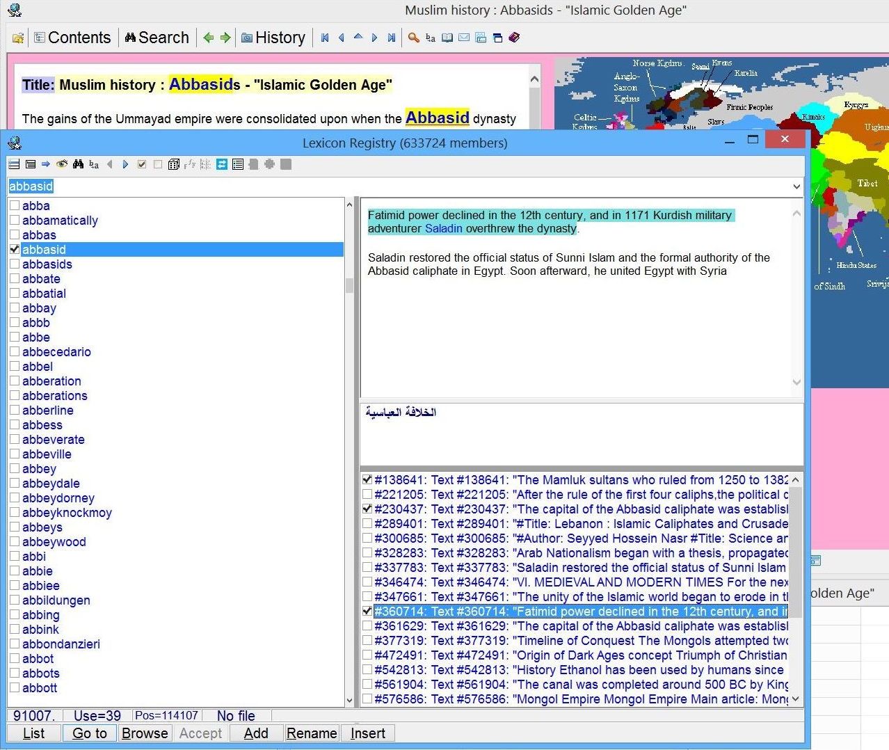 Lexicon registry which you can use to find a word in your collection as well as all texts and elements that use this word. In the picture, the registry keeps 955,665 words. On the left, in the top panel, an exemplary text from the collection containing the word abbasid. In the panel below it, the word's Arabic phonetic transcription (showcasing SuperMemo's support for Unicode). In the bottom panel, the list of text registry members with the word. Double-clicking the selected member in the list will open its corresponding entry in the text registry.